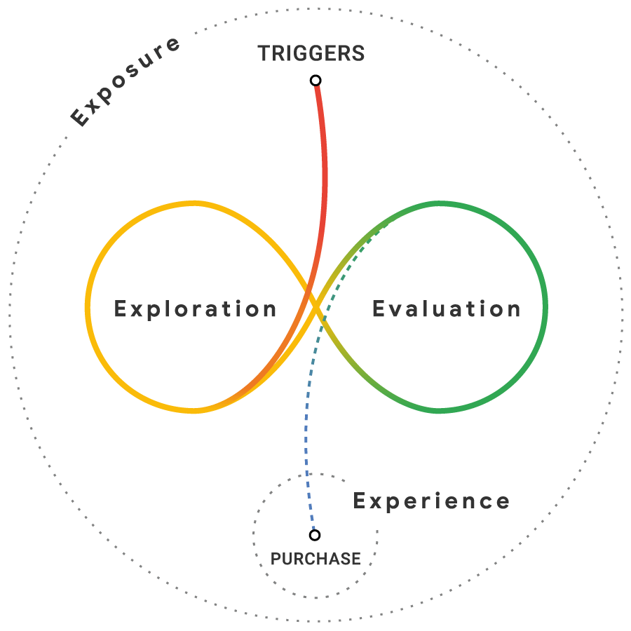 O modelo do Messy Middle sugere que, após um gatilho de necessidade, os consumidores entram em um loop ativo de duas atividades principais:
